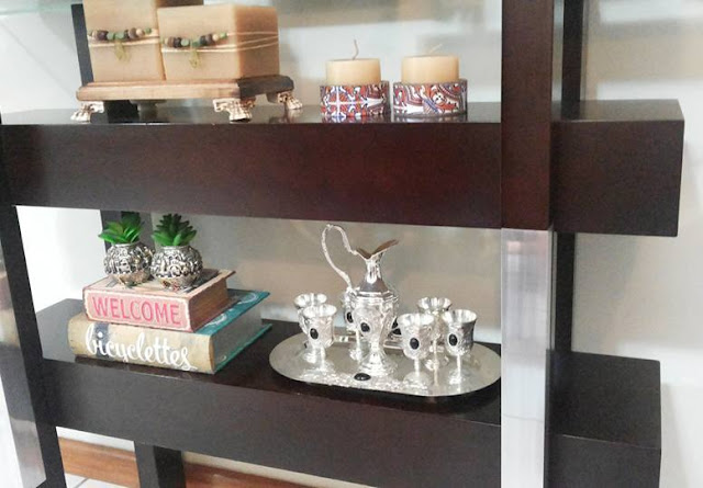 Na estante mudei as duas peças dos nichos superiores, coloquei dois objetos de decoração nesse tom de azul que sou apaixonada e achei que já deu uma carinha diferente do antes e depois. Meus móveis são escuros então os objetos precisam ser mais claros para não pesar muito e além disso eu ainda gosto de uma decoração em um estilo mais rústico...